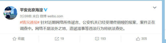 北京海淀警方:针对近期网络所传谣言,已受理佟丽娅报案