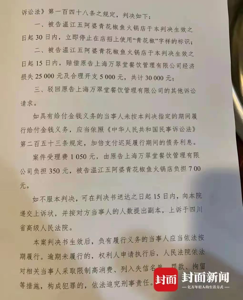 法院判决,被告温江五阿婆青花椒鱼火锅店于本判决生效之日起30日内,立即停止在店招上使用“青花椒”字样的标识;被告温江五阿婆青花椒鱼火锅店于本判决生效之日起15日内,赔偿原告上海万翠堂餐饮管理有限公司经济损失25000元及合理开支5000元,共计30000元。