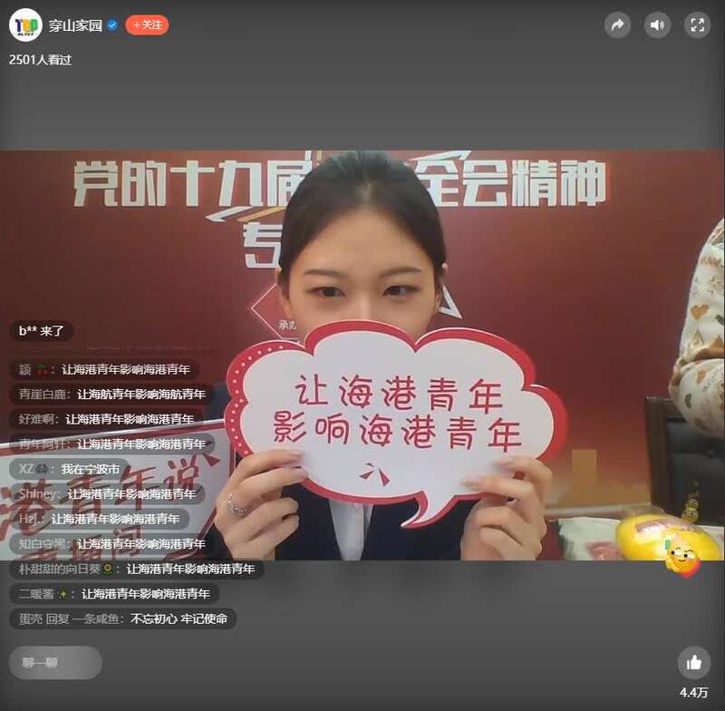 “直播开始啦,大家快来看看!”最近,浙江省海港集团、宁波舟山港集团青年理论宣讲团暨8090宣讲团“空降”海港青年说直播间,开启了一次特殊的党的十九届六中全会精神宣讲。看着自己熟悉的小伙伴在手机屏幕里宣讲,集团青年们纷纷围坐过来,在直播间里连连点赞。