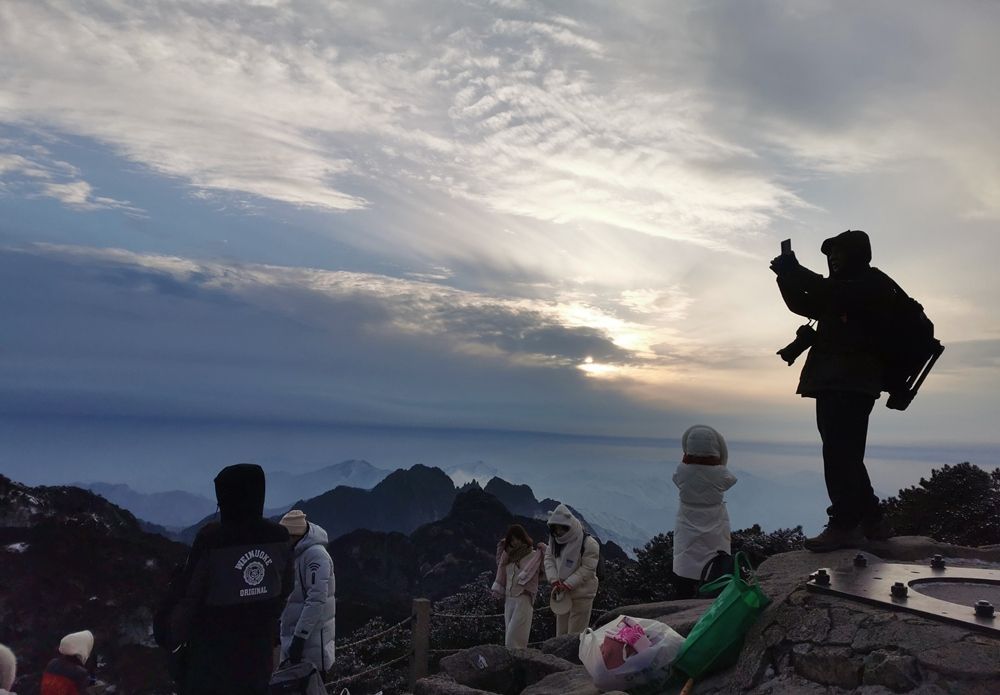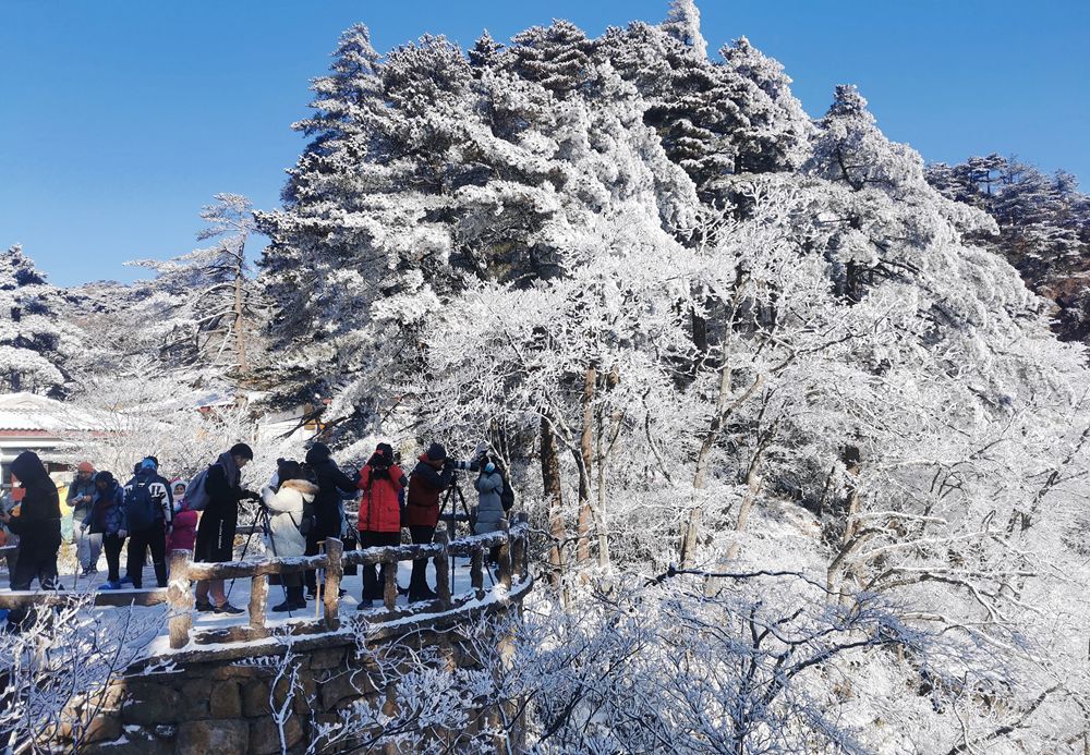 2021年12月26日,安徽省黄山市,黄山风景区游客在欣赏雪景。