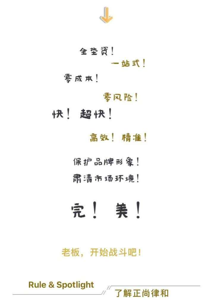 正尚律和的微信公号“正尚律和知识产权”中有一篇《正尚律和是怎么帮企业打假的?》文章,道出了正尚律和的运作模式:文章宣称委托方不用花一分钱,也不用出一个人。“正尚律和全国46个城市、32家律所的调查团队、专业律师就都是你的人”,文章还称2000+员工全国范围内地毯式排查,用时15到45天,《全国侵权报告》出炉,“你说打谁我们就打谁”,用时30天左右“民事诉讼or协商解决or行政查处or刑事追究,你说了算”。文章还称,整个过程全垫资,委托方零成本。