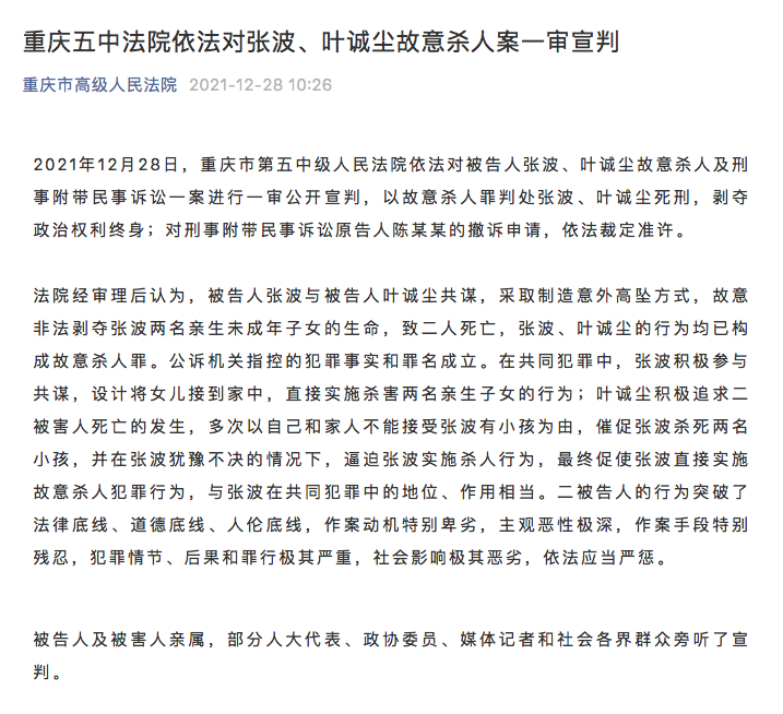 重庆市第五中级人民法院依法对被告人张波、叶诚尘故意杀人及刑事附带民事诉讼一案进行一审公开宣判,以故意杀人罪判处张波、叶诚尘死刑,剥夺政治权利终身。