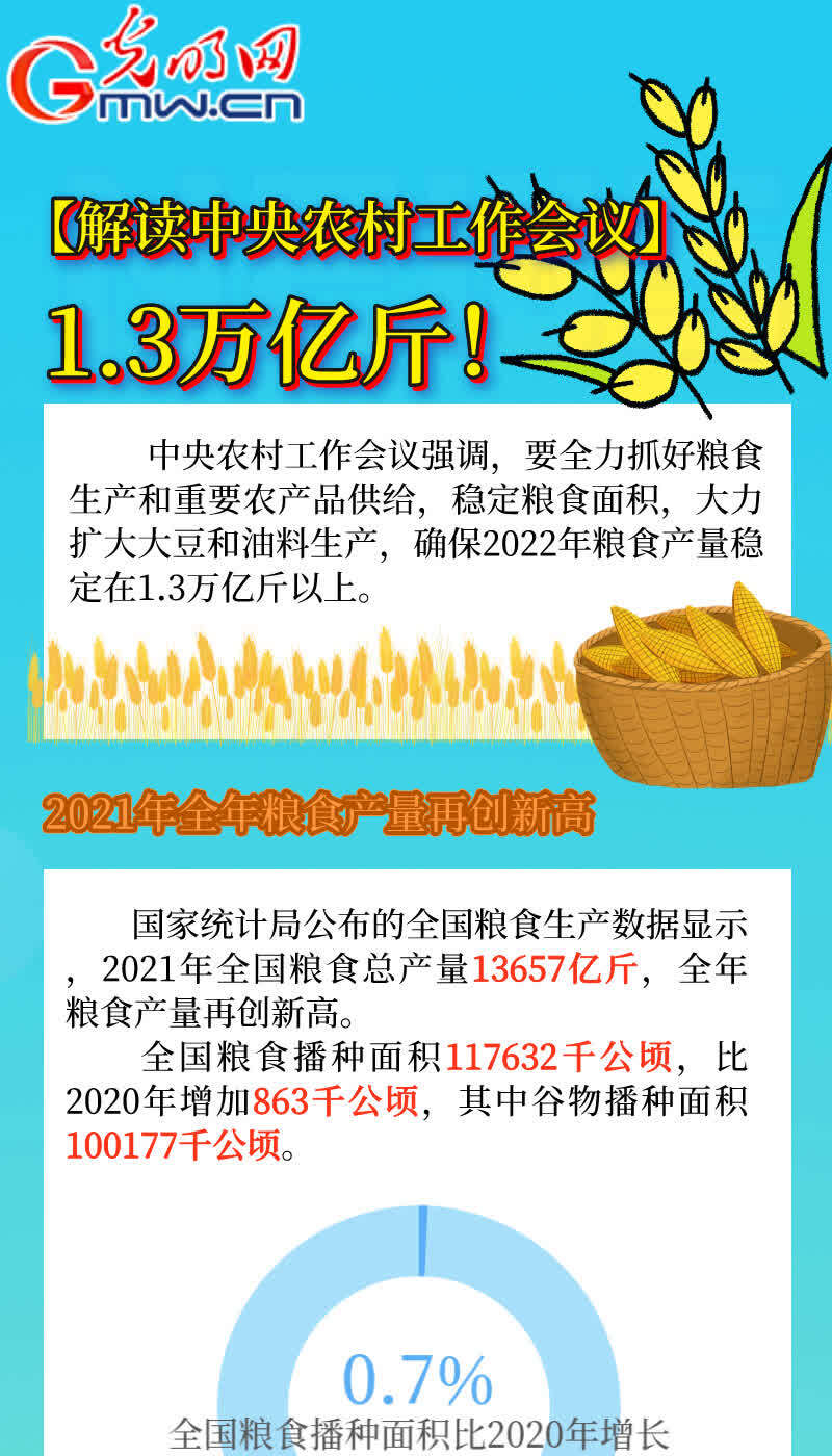光明网讯(记者 张慕琛)日前,中央农村工作会议强调,要全力抓好粮食生产和重要农产品供给,稳定粮食面积,大力扩大大豆和油料生产,确保2022年粮食产量稳定在1.3万亿斤以上。