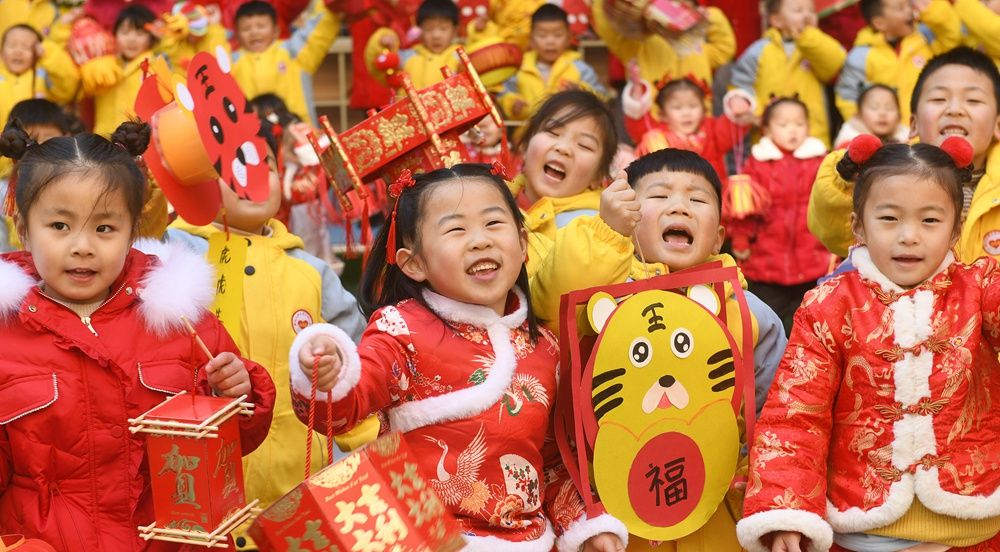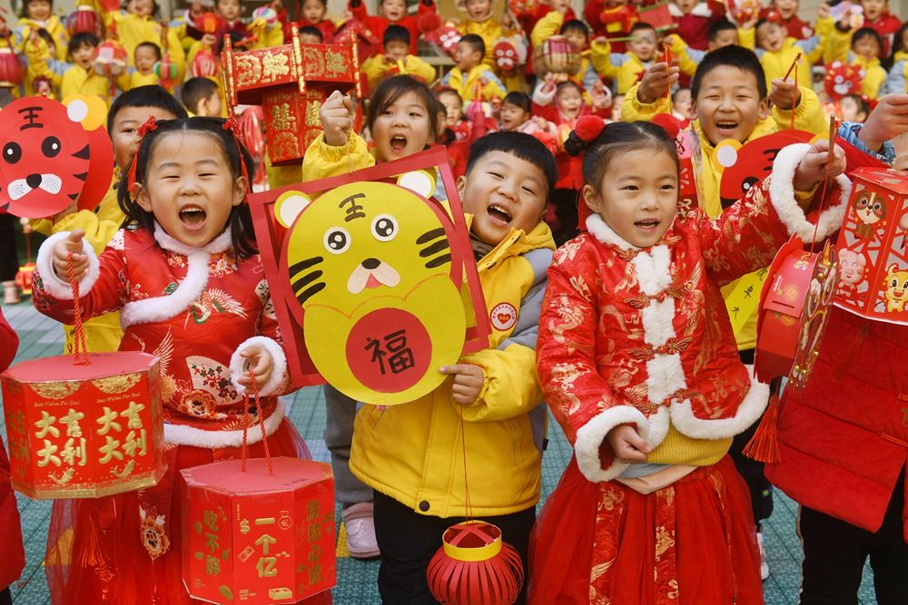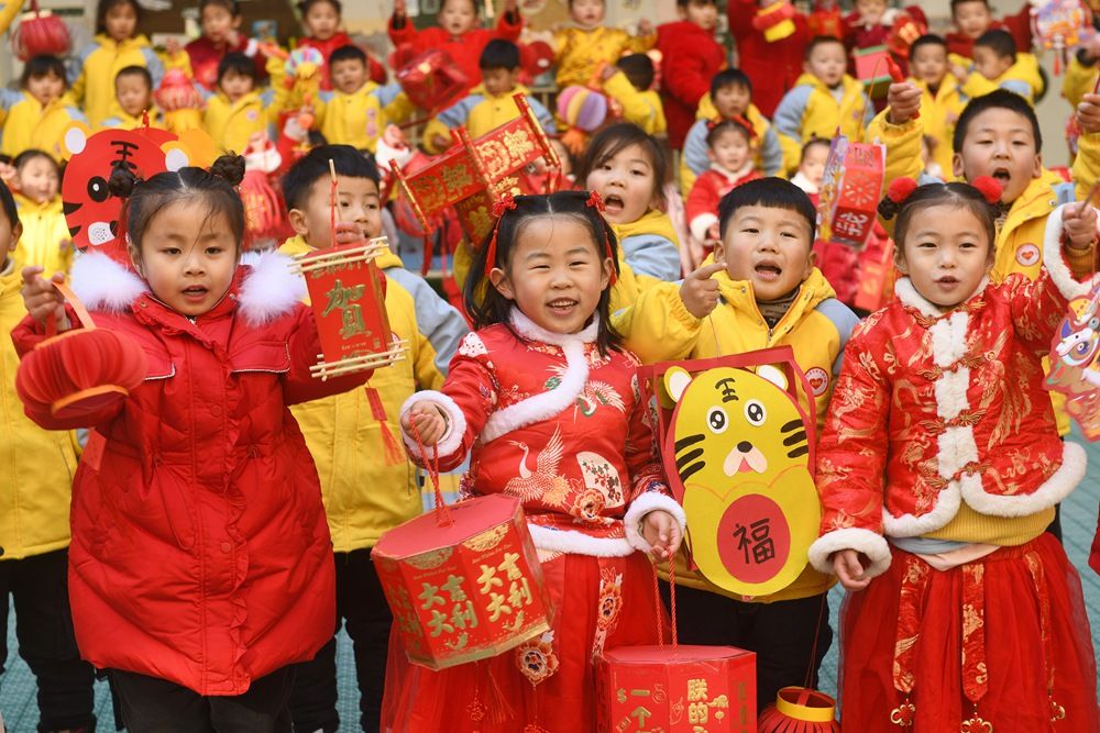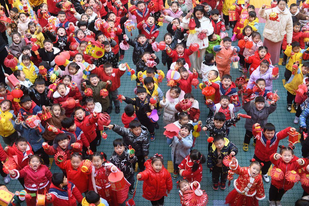 2021年12月28日,安徽省阜阳市颍东区新华幼儿园的小朋友高兴地展示和家长一起制作的花灯。