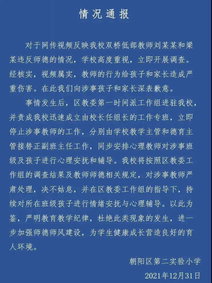 12月31日,一段朝阳区第二实验小学低年级老师“批评教育”孩子的视频在家长群中流传开来。朝阳区第二实验小学最新回应,对于网传视频反映学校双桥低部教师刘某某和梁某违反师德的情况,学校高度重视,立即开展调查。经核实,视频属实,教师的行为给孩子和家长造成严重伤害,学校向涉事孩子和家长深表歉意。情况通报如下: