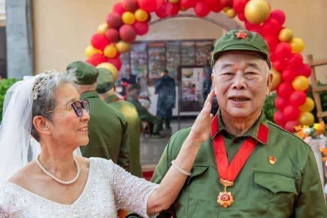 在早早布置好的心形花墙前,22对老兵伉俪手挽着手,“新娘”身着白婚纱,手捧鲜花,脸上笑靥如花,男老兵们身着军装,佩戴军功章,一个个精神抖擞,脸上洋溢着幸福的笑容。在大家的见证下,拍摄他们从未体验过的婚纱照。
