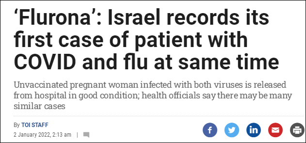 另据《以色列时报》报道,以色列此前也已于12月30日报告出现了一例同时患上新冠和流感的病例。该病患是一名未接种疫苗的孕妇,症状轻微。报道称其为首例“Flurona”病例,(即流感(flu)和冠状病毒(coronavirus)英文单词的拼接)。