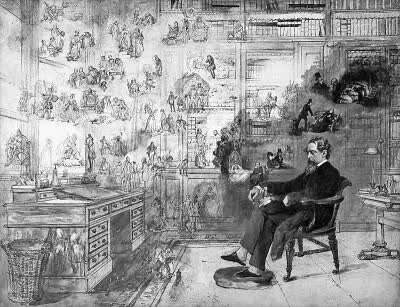 罗伯特-威廉·巴斯绘有《狄更斯之梦》(1875),画面中,狄更斯就是坐在这把椅子上,数不清的人物跌跌撞撞地从他的头脑里奔涌而出。在他书写的时候,椅子承载了千钧的重量,想象中的世界都托举在它的上面。它与作家的关系最为亲密,独处的时间也最长。夜色之中,当一切喧嚣都消散离去的时候,只有它还在那里,在创作的现场——它保守了这位作家所有的秘密。