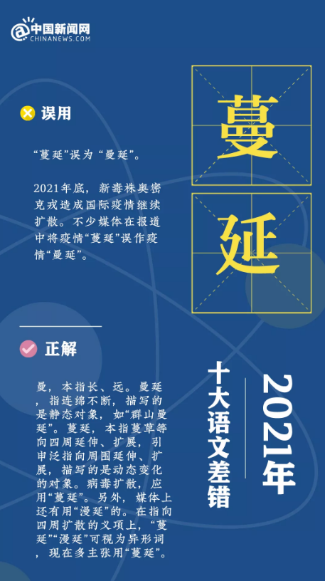 2021年底,新毒株奥密克戎造成国际疫情继续扩散。不少媒体在报道中将疫情“蔓延”误作疫情“曼延”。曼,本指长、远。曼延,指连绵不断,描写的是静态对象,如“群山曼延”。蔓延,本指蔓草等向四周延伸、扩展,引申泛指向周围延伸、扩展,描写的是动态变化的对象。病毒扩散,应用“蔓延”。另外,媒体上还有用“漫延”的。在指向四周扩散的义项上,“蔓延”“漫延”可视为异形词,现在多主张用“蔓延”。
