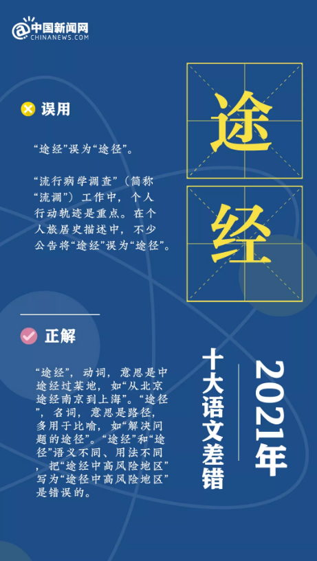 “流行病学调查”(简称“流调”)工作中,个人行动轨迹是重点。在个人旅居史描述中,不少公告将“途经”误为“途径”。“途经”,动词,意思是中途经过某地,如“从北京途经南京到上海”。“途径”,名词,意思是路径,多用于比喻,如“解决问题的途径”。“途经”和“途径”语义不同、用法不同,把“途经中高风险地区”写为“途径中高风险地区”是错误的。