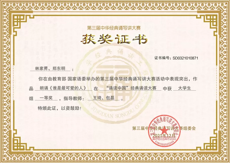 同样在2021年底,在教育部、国家语委举办的第三届中华经典诵写讲大赛中,上海戏剧学院电影学院播音与主持艺术专业2018级的林家昇、2019级的郑东明朗诵的《谁是最可爱的人》(指导教师:王琦、包磊),从1020部作品中脱颖而出,斩获“诵读中国”经典诵读大赛大学生组一等奖。