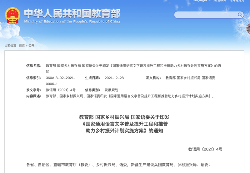 据悉,教育部、国家乡村振兴局、国家语委将指导各地抓好落实,并对各地工作进展情况适时开展调度,确保按时完成国家通用语言文字推广普及各项任务。
