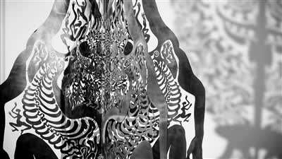 玛塔·罗伯蒂的《异世界动物寓言集》是一个八屏屏风装置,非常巧妙地在石墨复写纸上描绘了《神曲》中的动物,这些动物以不同的形态出现:有的是真实的,有的是用来描述被诅咒、被净化和被祝福的灵魂的相似之物,最后是动物和人混杂的神话生物。仔细观看每一屏的画面,你可以认出但丁在幻游中遇到的动物,比如鸟身人头的女妖哈尔比。薄薄的透光复写纸随空气微微颤动,在LED灯的晕染下,展开一个异世界。