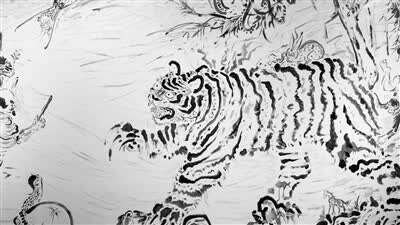 这一部分展览还包括了艺术家吴俊勇为展览现场特别绘制的《风穿过松林》,即兴的笔触和“天花乱坠”般的寓意形象布满墙面,罗汉坐上了愚人船,美人鱼与山羊人对奏,在艺术家的想象中,中西方的神话和寓言场景无缝对接了。