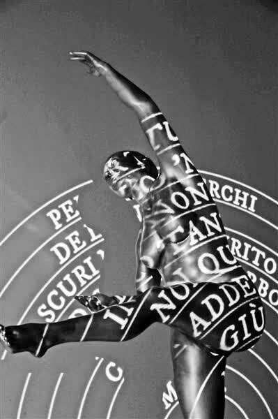 走出“饕餮层”,进入马里内拉·塞纳托雷的《攀登星辰》装置,三个形似舞蹈中的人的石膏雕塑立在黑暗中,等待一段段不同寓意形状的文字被投影在其上。这件作品的灵感也是来自《神曲》地狱篇,关于但丁遇到的一个万恶不赦之人万尼·符契,他针对但丁的党派无恶不作,还是一个偷窃圣物并栽赃他人的小人,甚至在但丁面前亵渎上帝,他在书中会一直经历蛇的咬噬。而在《攀登星辰》中,艺术家改写了此人的命运,让他也获得了救赎。