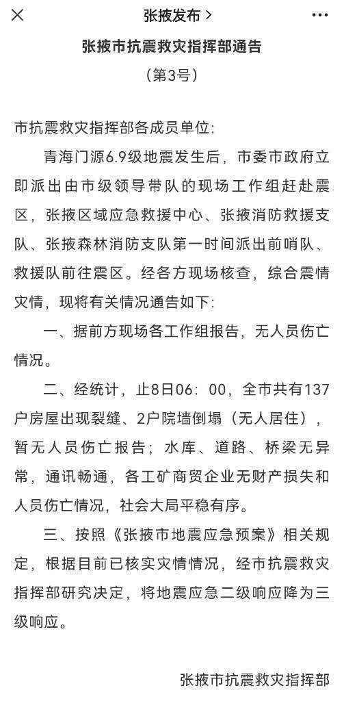 中国青年报客户端兰州1月8日电(中青报中青网记者王豪)据甘肃省张掖市抗震救灾指挥部消息:按照《张掖市地震应急预案》相关规定,根据目前已核实灾情情况,经市抗震救灾指挥部研究决定,将地震应急二级响应降为三级响应。