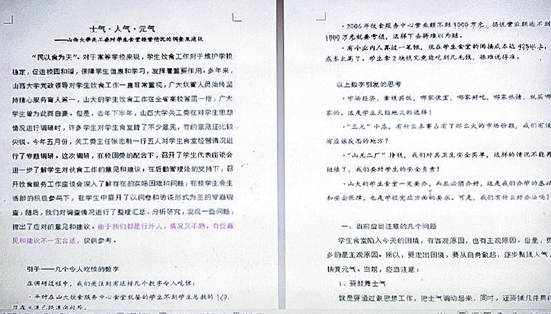 对学生食堂状况进行调研,了解学生吃什么?关工委曾多次召开由各个院系学生代表、管理干部和饮食服务人员参加的座谈会,综合了解学生对学校伙食工作的意见和建议,以及当前饮食工作中存在的问题,向部分二级学院发放调查问卷,了解学生需求和愿望,一份《士气·人气·元气》调查报告,让学校掌握了餐厅改进的方向。