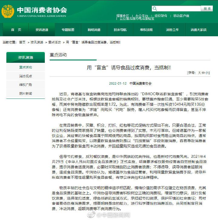 12日,中消协发文称,近日,肯德基与盲盒销售商泡泡玛特联合推出的“DIMOO联名款盲盒套餐”,引发消费者抢购及社会广泛关注。有消费者不惜一次性斥资10494元购买106份套餐;还有消费者为“求娃”而购买“代吃”服务,雇人代买代吃套餐而获得盲盒,甚至不排除将吃不完的食物直接丢弃。中消协认为,肯德基作为食品经营者,利用限量款盲盒销售手段,诱导并纵容消费者不理性超量购买食品套餐,有悖公序良俗和法律精神。