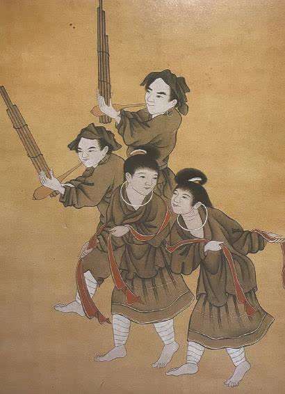此外,“风”乐图中还保存了反映我国少数民族音乐活动的作品,这类图像大多与他们的生产和生活习俗有密切关系,蕴含着浓郁的民族审美特色。如清代云南巍山彝族壁画中的树下踏歌图可能是为“祭庄稼”而举行的盛会。《广舆胜览》(清刻本)中苗族乐舞图是苗族“每岁孟春跳月,男吹芦笙,女振铃唱和,并肩舞蹈,终日不倦”(倪辂《南诏野史》)的真实写照。