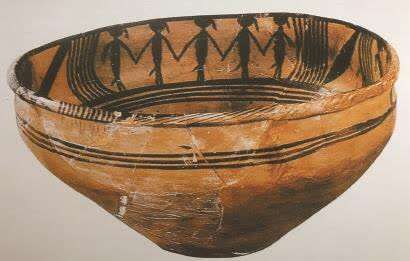 青海省大通县上孙寨出土的人物彩陶盆内侧出现了原始先民手拉手歌舞的视觉图像