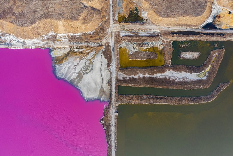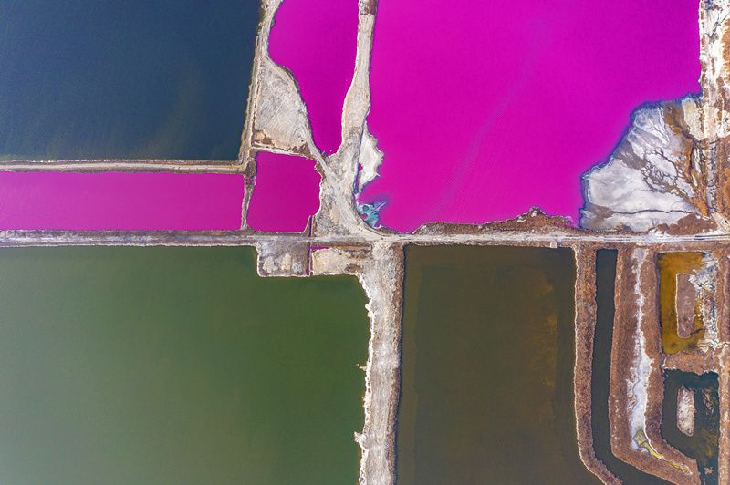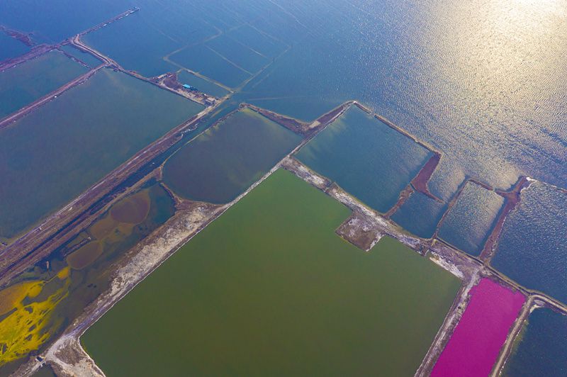 2022年1月12日,山西运城,盐湖部分水域呈现玫瑰红。