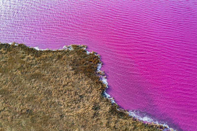 随着天气变化生长着一种叫杜氏盐藻的嗜盐绿色微藻,在一定条件下会产生血红素,藻体呈红色,因而会把湖水染成红色,成盐湖独特景色。