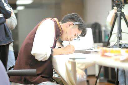 在对藏文书法进行数据采集时,受测者头戴的设备形似耳麦,轻卡在头顶。