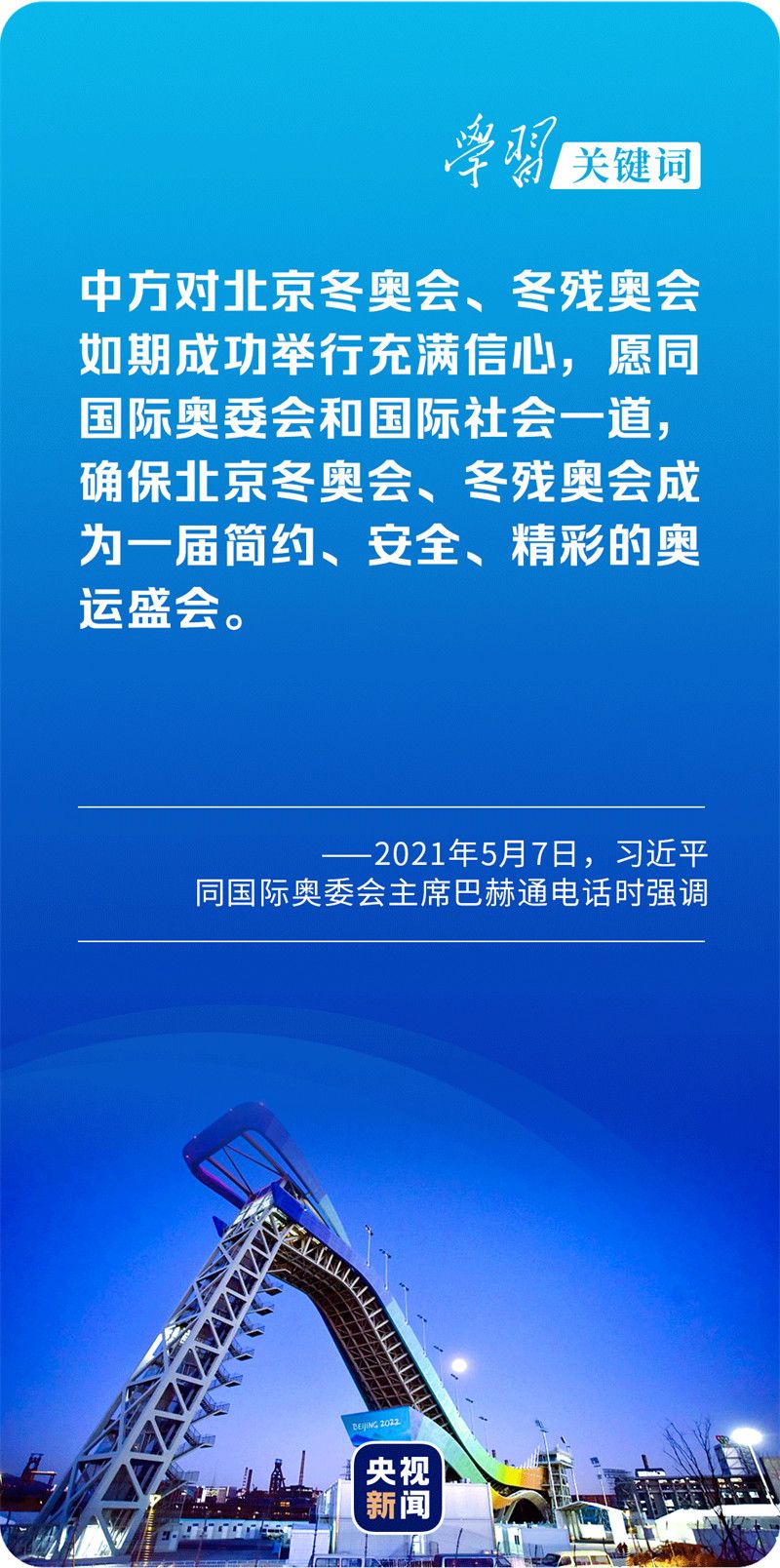 北京冬奥会、冬残奥会将以全球共通的体育语言和体育精神,为推动构建人类命运共同体提供新的舞台。