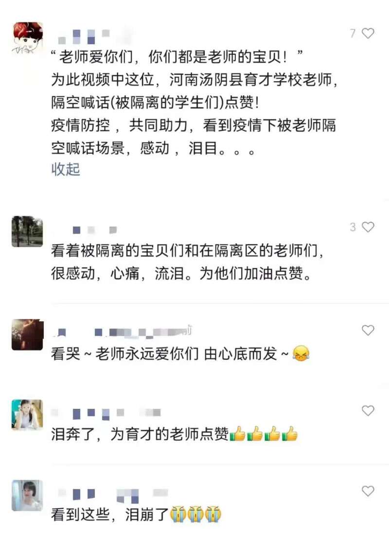 1月12日晚,网上一条名为《育才学校老师隔空比心,喊话被隔离学生》的视频火了。视频中,自称“苗苗老师”的女子身着防护服,在学生们隔离的楼道内来回巡视,一边叮嘱大家按时吃饭、锻炼身体,一边隔空给学生们“比心”喊话:“苗苗老师爱你们!你们都是老师的宝贝!我们一起加油!我们一定会回家过年!”语气坚定,脚步轻快。不少网友表示,自己是流着泪看完视频的。网友“安好”说:“一字一句,是老师的鼓励,更像母亲的叮咛。”