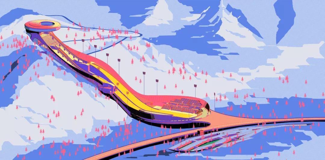 以往冬奥会跳台场馆的跳台落差超百米,普通人用不了,也提供不了很好的观光体验。因此,“雪如意”设计中沿用了一个在城市设计或目的地设计中经常用到的原则,“2.5小时慢行体验”。比如爬山,从山脚爬到山顶,如果是2.5小时完整体验,我们就会认为这是一个目的地之旅,这个过程会留存在记忆中,成为有意义的东西。空中步道“冰玉环”周长1.7公里,距地面高7米,连接“雪如意”、国家冬季两项中心、国家越野滑雪中心、山地转播中心与技术官员酒店,便于观众往返于场馆间,形成一个慢行体验。