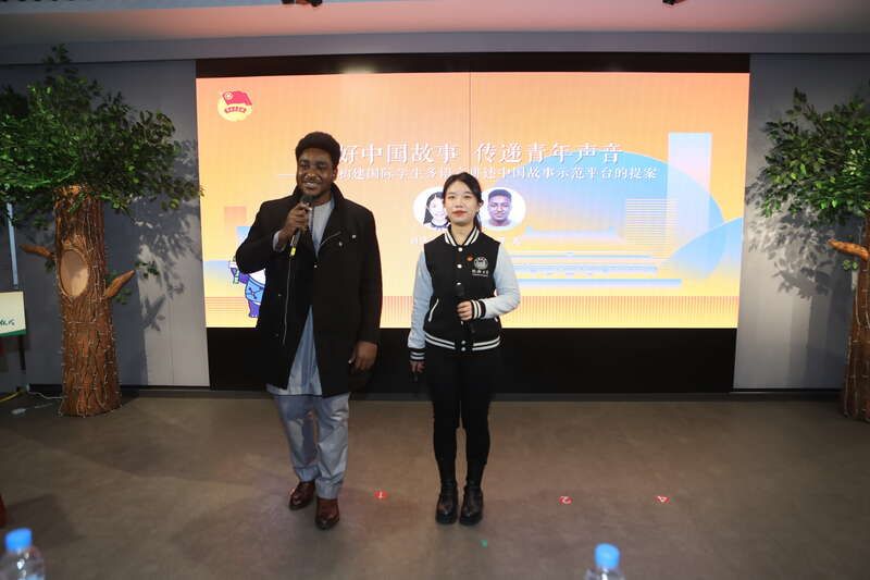 图为同济大学留学生罗克和中国学生陈思瑶一起上台分享自己的人民建议 团市委供图