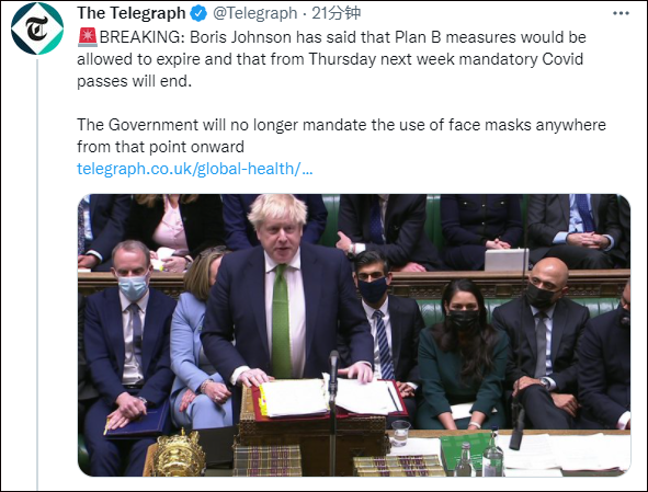 此外,英国政府还决定,从明天(20日)起,英格兰学校将不再强制要求学生戴口罩;关于“自我隔离”的法律将于3月24日到期后失效。