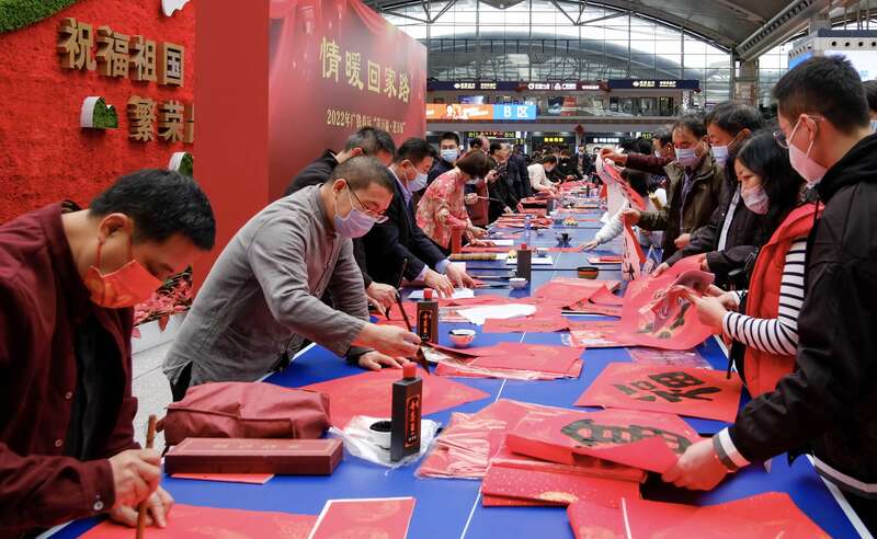 春运首日,在广州南站3楼候车大厅内,广铁集团联合广东省文联、广州市文联开展了“我们的中国梦”——文化进万家活动之“情暖回家路”2022广铁春运“送万福·进万家”文化公益活动。省、市、区及铁路部门的18名书法家挥毫为旅客送“福”字,写春联。今年是广铁集团第7次组织开展“送万福·进万家”活动。