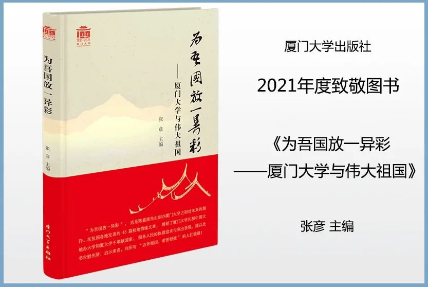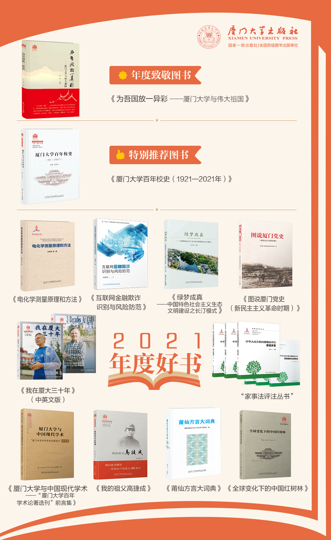 【推荐理由】该书深入挖掘厦大与全国34个省级行政区、福建9市1区的校地情缘,通过43篇专题文章,反映近百年来厦大紧密围绕国家和地方战略需求,主动为国家和地方服务,在地方人才培养、科学研究和社会服务等方面作出的努力和贡献,以及一代又一代厦大人扎根五湖四海、放歌天南地北、书写家国情怀的感人故事。