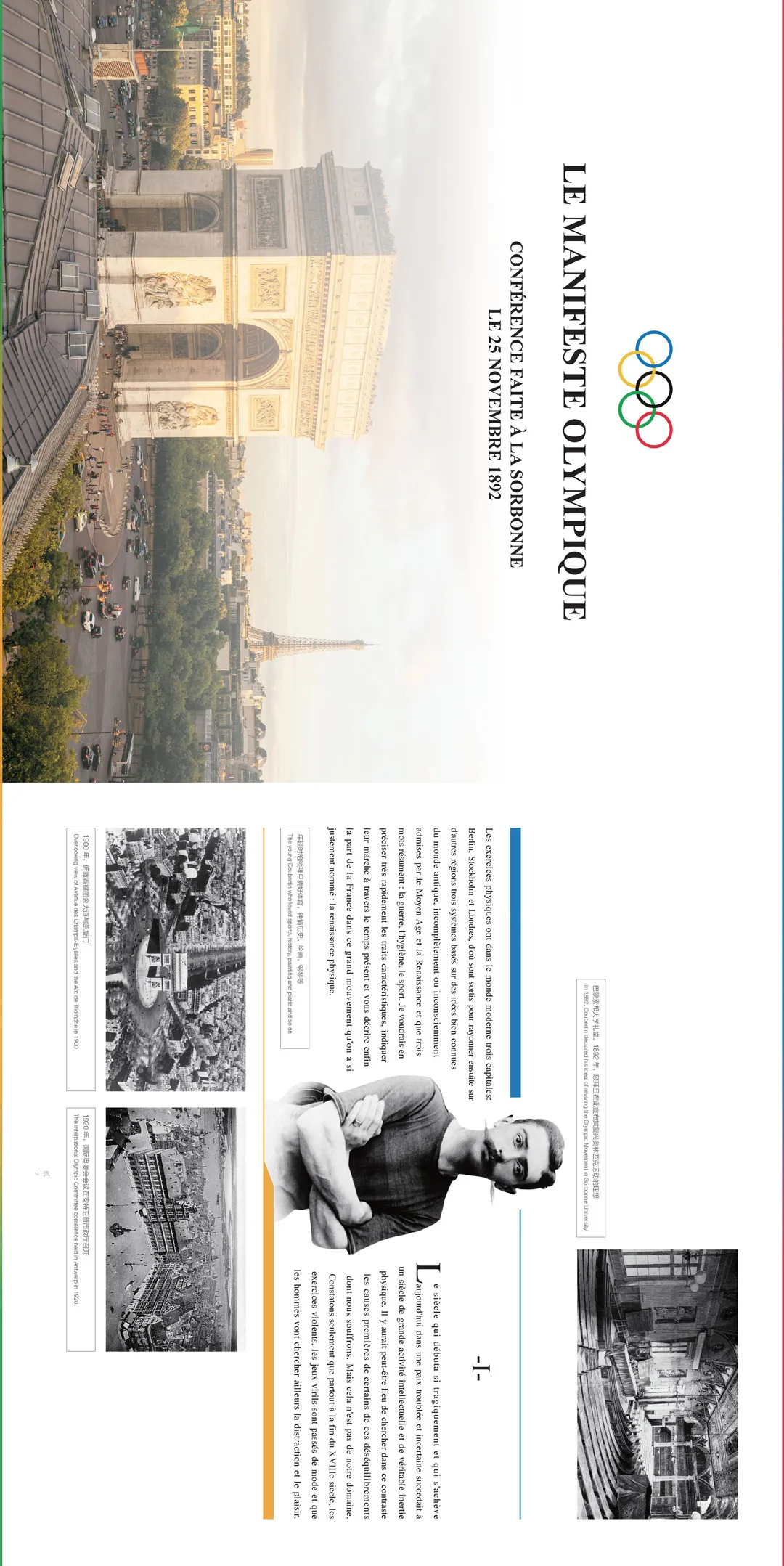 1892年11月25日,顾拜旦在法国首都巴黎发表了著名的《奥林匹克宣言》,现代奥林匹克运动由此诞生。1894年6月23日,国际奥委会在法国巴黎创立,现代奥运会的组织运营体系开始构建。1896年4月6日,首届现代奥运会在希腊雅典成功举办,将顾拜旦的现代奥林匹克运动理念付诸实践。
