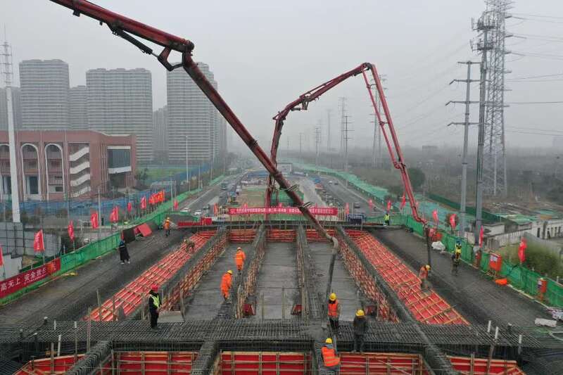 一个四四方方的建筑工地里,一群建设者们为合肥的交通发展忙碌着。今天是农历小年,合肥市宿松路快速化改造3标首联现浇箱梁开始浇筑,这是工程全线首个浇筑的现浇箱梁,标志着工程建设取得重大进展,即将步入上部结构施工阶段。这一快速化改造工程是合肥“五横七纵”规划骨架快速路网体系重要组成部分,构建合肥老城区与新区、开发区之间的快速交通走廊,对促进沿线地块开发、提高城市综合竞争力具有重要意义。“项目全长2396米,此次浇筑的主线桥采用单箱多室斜板带圆弧断面,浇筑混凝土约980立方,40余人投入一线战斗。”施工方中铁四局的项目副经理徐磊介绍,桥梁上部结构采用现浇预应力连续梁和钢箱梁组合结构,减小多施工范围内交通影响。25岁的项目技术主管刁科家乡在重庆,入职两年多来来,很少回家,跟着项目天南地北地跑。