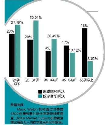 Music Watch 机构通过对美国4800位黑胶唱片听众年龄段抽样调查;Digital Market Outlook机构调查得出每百万人内数字音乐听众年龄段。