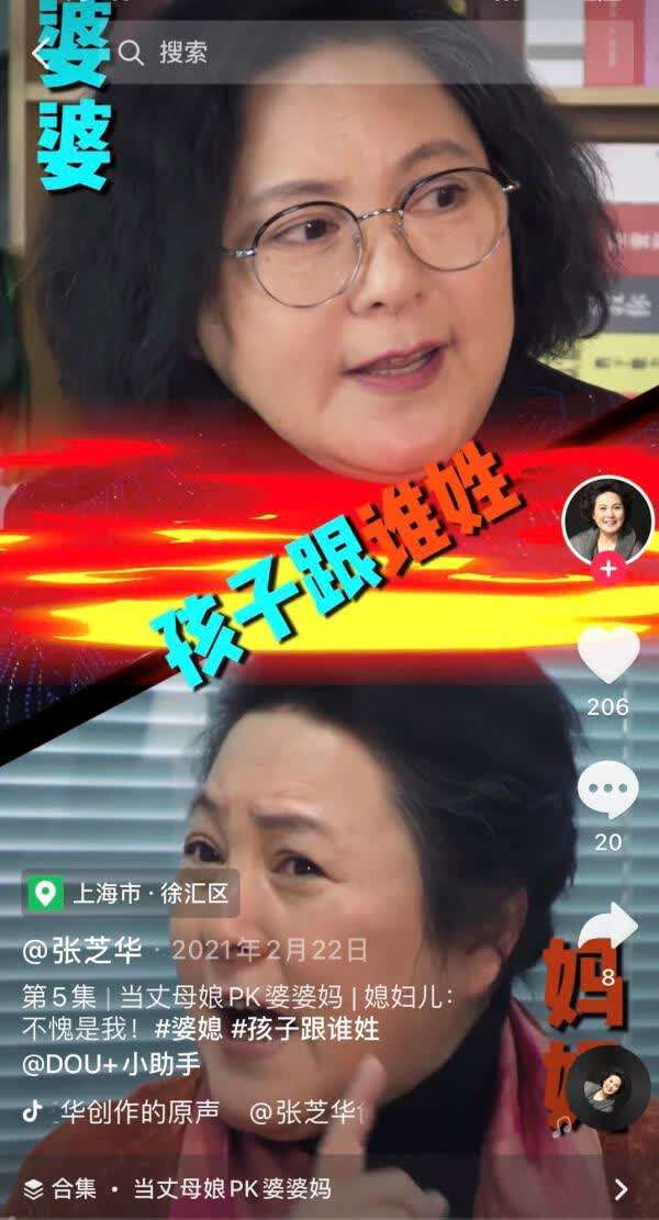 如今身为“国民妈妈”的张芝华,还开设了自己的抖音账户。创作短视频,她有一个自己创作的小“套路”——一人分饰丈母娘和婆婆两个角色,分别站在男女不同的角度去拆解分析婚姻家庭中会遇到的问题,比如夫妻谁管钱、没有房子能不能结婚、要不要孩子、要不要二胎、要不要请月嫂等等。终于掌握了主动权的张芝华,在自己的抖音里一点儿不搞对立,代表两边共同为一个小家庭的幸福生活考虑,既表达身为母亲出于现实因素的担忧,又不遗余力地给予长辈的支持。也许,这才是她心目中,最想传递出的妈妈的样子。