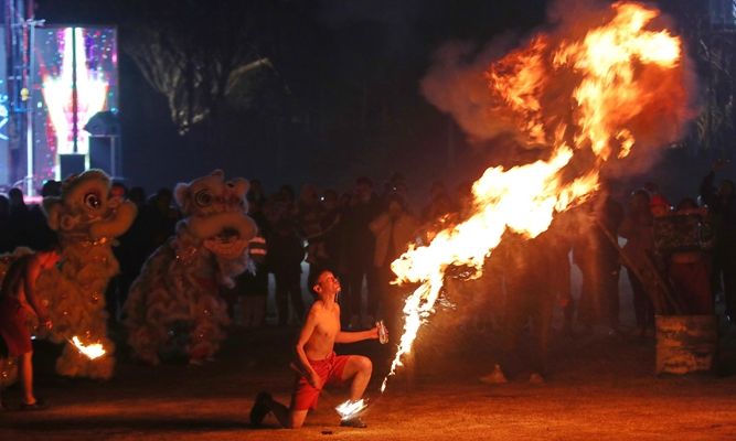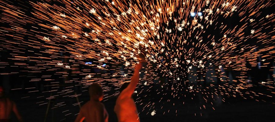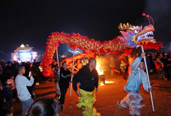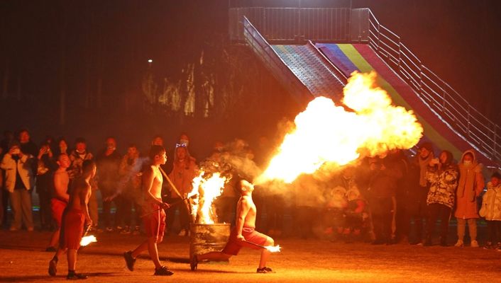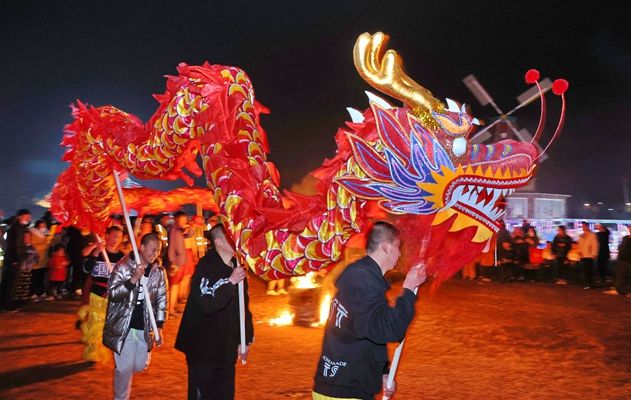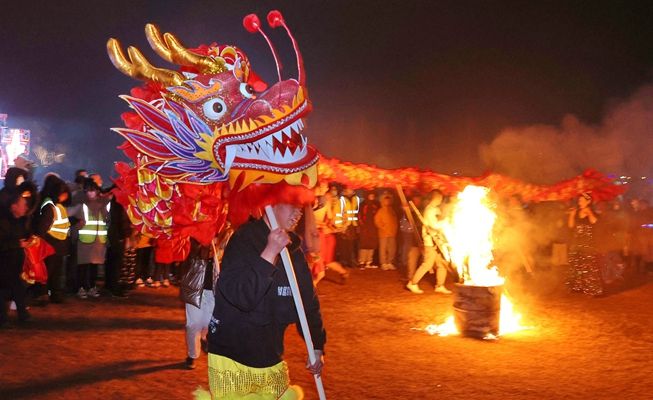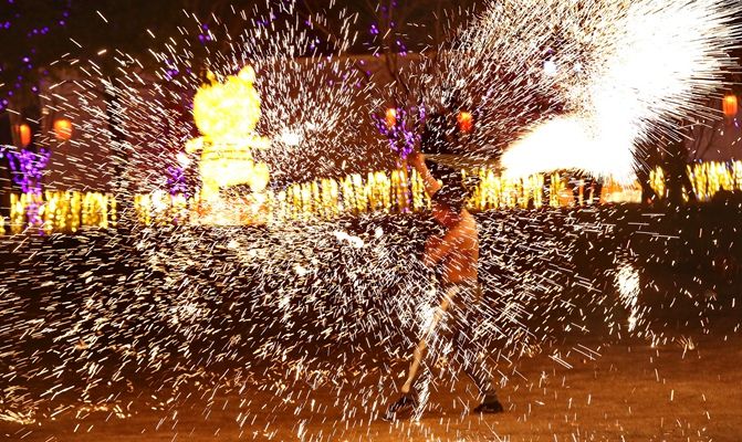 2022年1月24日晚,江苏省南通市通州区一景区上演了精彩的夜舞龙灯、舞狮、打铁花灯等活动,吸引了众多游客观看、互动,喜迎即将到来的新春佳节。
