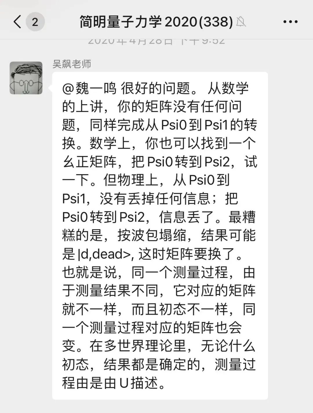 “吴老师随时会在微信群答疑,只要大家有关量子力学方面的问题都可以给出很通俗易懂的解释,这点让我十分钦佩。