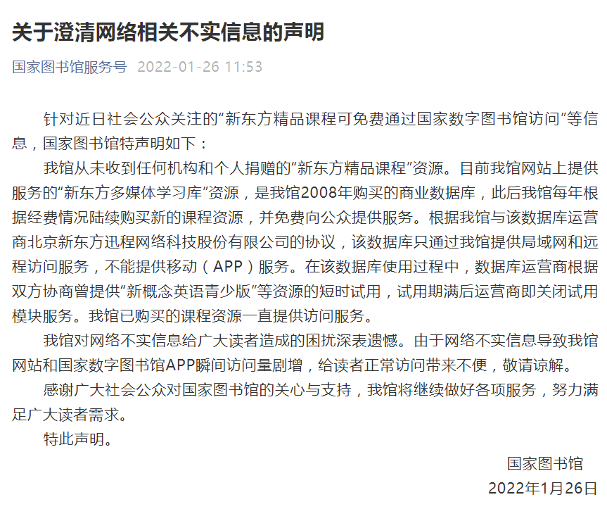 针对近日社会公众关注的“新东方精品课程可免费通过国家数字图书馆访问”等信息,国家图书馆特声明如下: