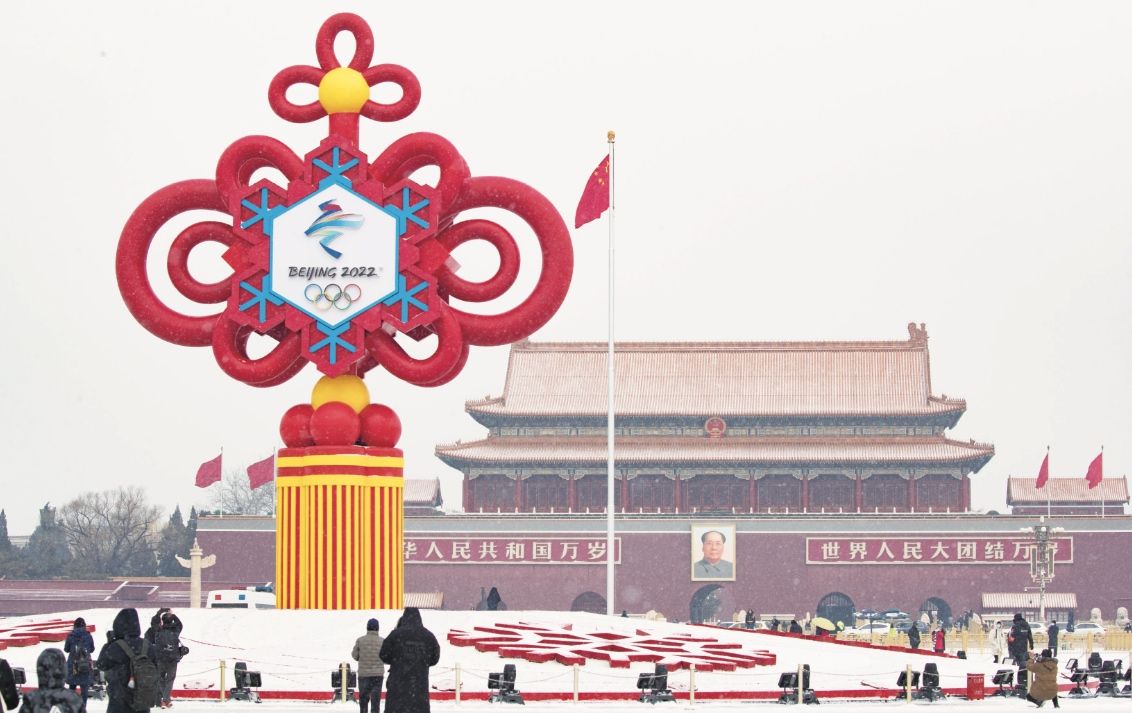 1月20日,北京迎来2022年首场降雪,民众在雪中游览北京天安门广场。 图片来源 视觉中国