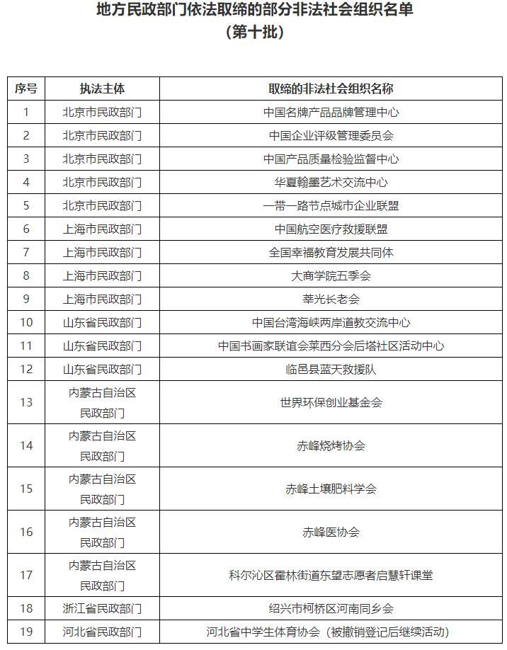 为持续加大舆论宣传力度,提高公众防范意识,发挥社会监督作用,现向社会公布第十批地方民政部门依法取缔的部分非法社会组织名单。社会公众如果发现名单中的非法社会组织仍在开展活动的,可依法向公安机关报案。同时,提醒有关机构和社会公众,在与社会组织开展合作或参与其活动时,请通过“中国社会组织政务服务平台”(www.chinanpo.gov.cn)、“中国社会组织动态”政务微信(微信号:chinanpogov)核实其身份,避免上当受骗;也欢迎社会各界通过“中国社会组织政务服务平台”提供涉嫌非法社会组织活动线索。