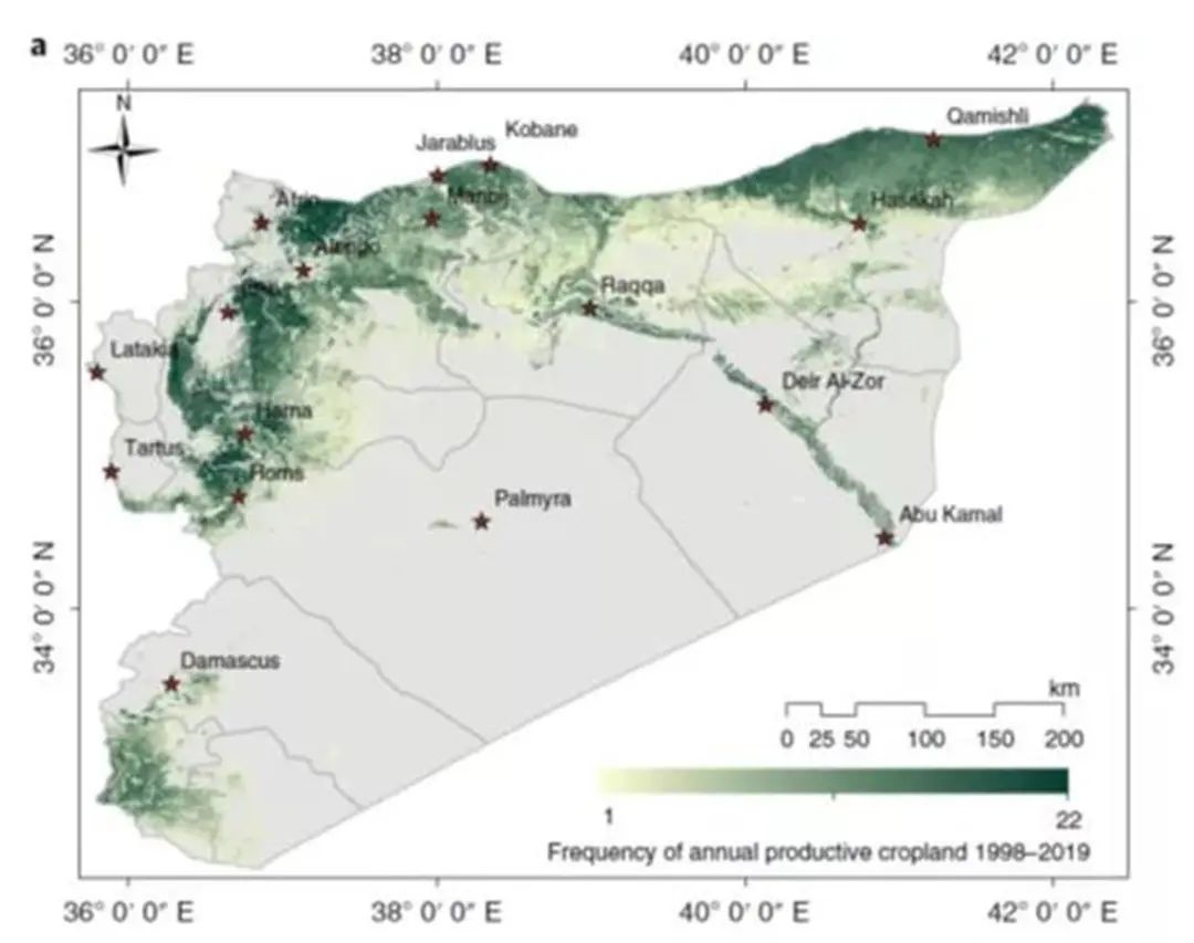 “战争并非叙利亚耕地减少的首要因素”这一结论让人有些意外。“通常情况下,战争会导致抛荒”,李熙解释,在叙利亚西北部城市阿勒颇、东南部代尔祖尔地区等战争胶着地区,确实显示出耕地减少、农作物减产;但在大马士革以及局势相对稳定的库尔德地区,许多原本种植果树的土地变成了农田,耕地面积出现大幅增长。