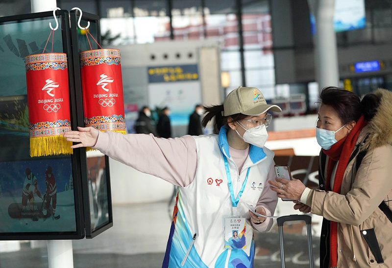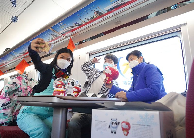 2021年12月30日,首次乘坐京张高铁去崇礼滑雪的市民陈天宇(中)正和其他乘客合影留念。京张高铁开通两年来,共发送旅客1380余万人,日均1.9万人。京张高铁、崇礼铁路、延庆线将北京、张家口两地的冬奥赛区紧密相连,是北京冬奥会的重要交通保障设施。