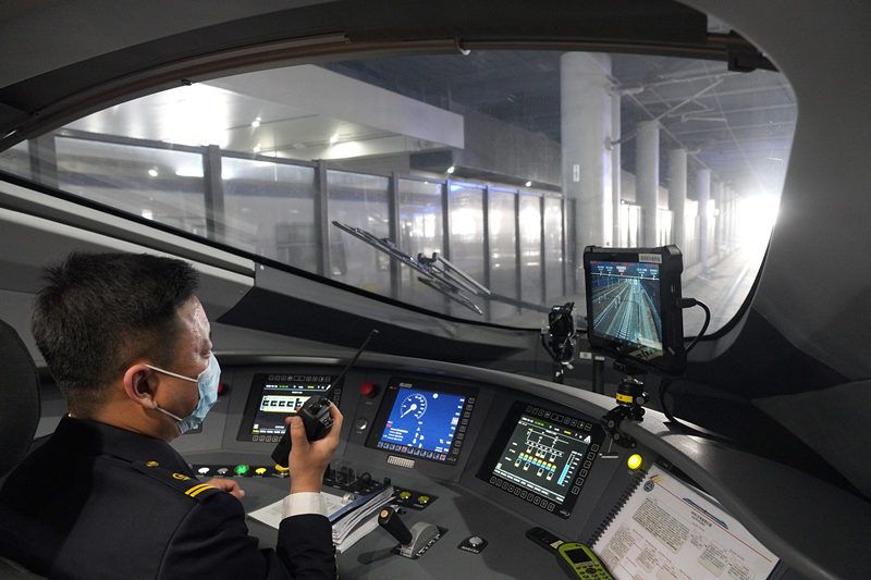 2022年1月6日,北京冬奥列车司机通过对讲机和列车长沟通信息。京张高铁在世界上首次实现时速350公里自动驾驶,具备车站自动发车、区间自动运行、到站自动停车、车门自动控制等功能,司机只需通过按键,即可实现自动驾驶。