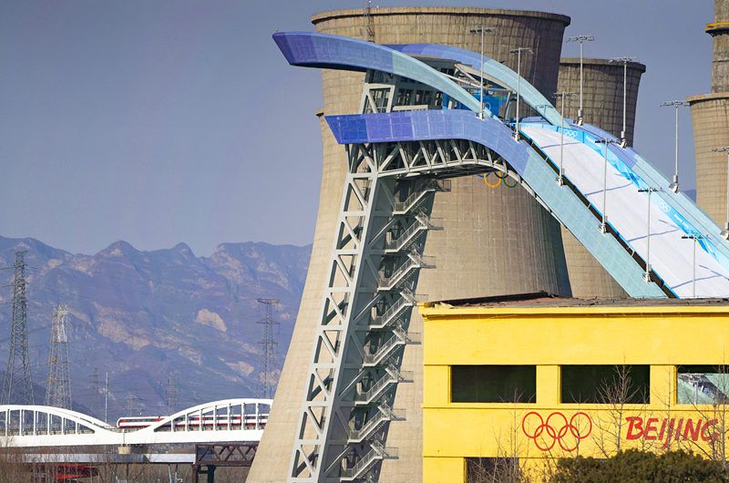 2022年1月16日,北京首条磁悬浮地铁列车驶过北京冬奥会比赛场馆首钢滑雪大跳台。首钢园周边轨道交通纵横交织,为市民出行提供了便利。