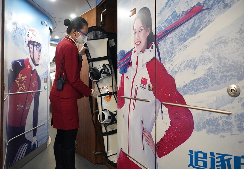 2021年12月30日,京张高铁复兴号智能动车组乘务员正在摆放滑雪板。服务冬奥会的智能动车组列车设置了滑雪器材存放柜,为自带装备的滑雪爱好者提供便利。