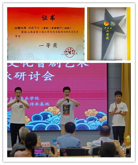 在学校、基地以及晋剧专家学者等多方力量的高效协作中,基地的桃李终散芬芳。2020年12月,基地学生社团晋剧艺术传承社代表山西大学参加由山西省教育厅主办的山西省第六届大学生艺术展演活动,凭借晋剧《卖画劈门》中白茂林的唱段荣获戏剧类甲组一等奖。