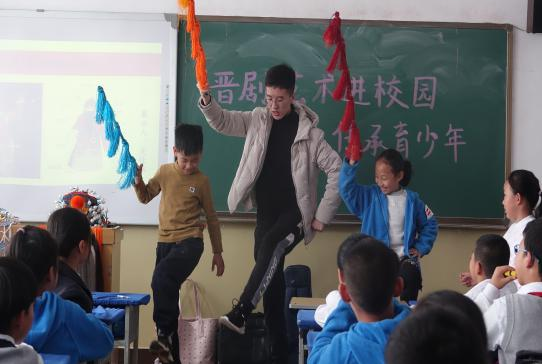 为了扩大晋剧影响范围,辐射带动青年人以关注传统文化发展,晋剧基地还在校园里广泛开展各种表演活动,带动大学生感受晋剧文化。同时积极开拓周边中小学及社区的受众群体,将晋剧基地特色活动和表演带到中小学音乐、美术课程和社区居民的文化生活中。通过现场表演经典晋剧选段、展示晋剧服饰、配饰、马鞭等行头实物以及引导学生学习马鞭髯口功、穿戴服装配饰等形式,极大地调动了学生们的兴趣和积极性。在主讲人对晋剧人物形象和故事情节的讲解中,青少年对晋剧的兴趣也越发浓厚。